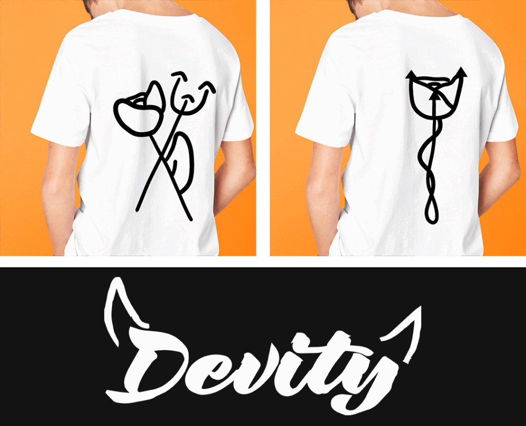 Devity Tijdens deze opdracht moest ik een eigen kleding merk opzetten.De kleding laat twee verschillende kanten van mensen zien. De roos en de drietand kunnen vergeleken worden met de engel en de duivel die in iedereen zit.